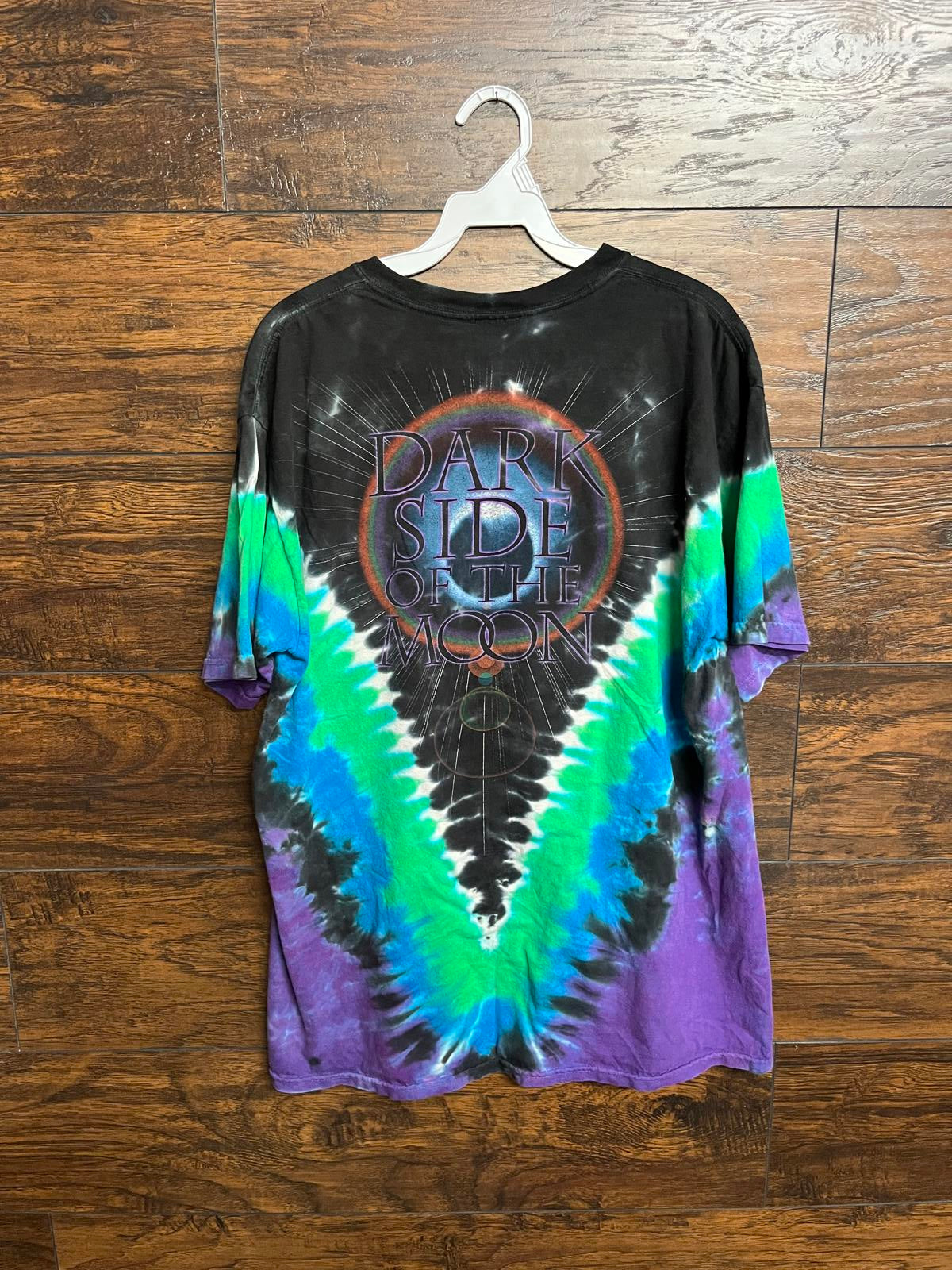 Liquid Blue Pink Floyd T-shirt V Tie Dye - Dark Side of the Moon Tee DSOTM Copyright 2004 FRONT: Triangle BACK: DARK SIDE OF THE MOON SIZE: Large Brand: Liquid Blue Material: 100% Cotton Condition: Good / Used Sizing: Large Length: 29.5 inch Width: 21 inch If you have any questions, need more pics... let me know :)