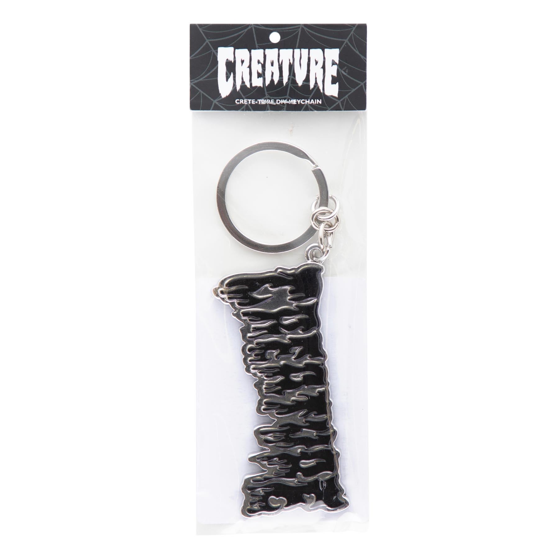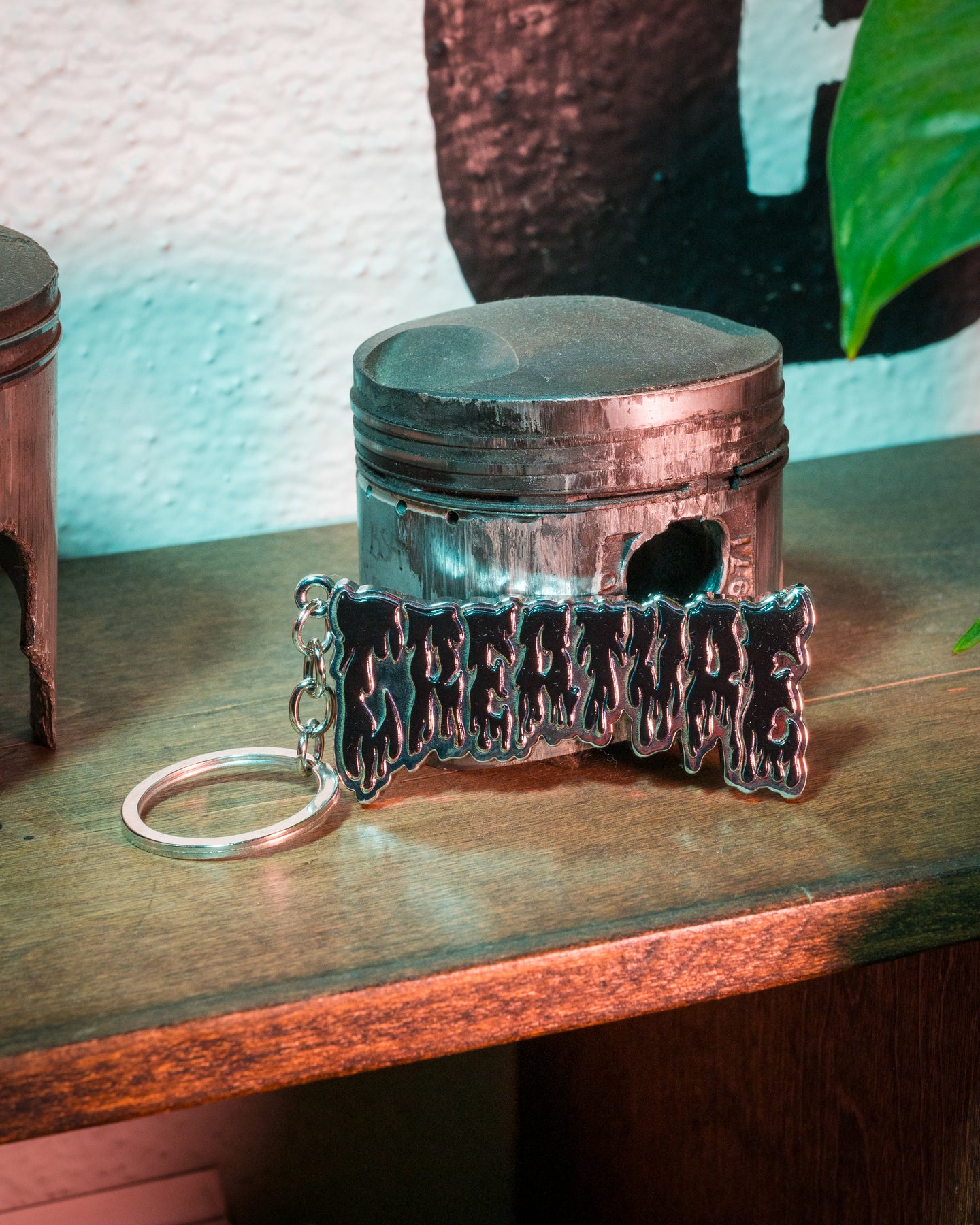 The Creature Hesher Flame stainless steel keychain is 3" X 1.31" and features silver and enamel filled Creature Hesher Flame artwork on front and "RIDE WITH US - DIE WITH US" embossed on back.