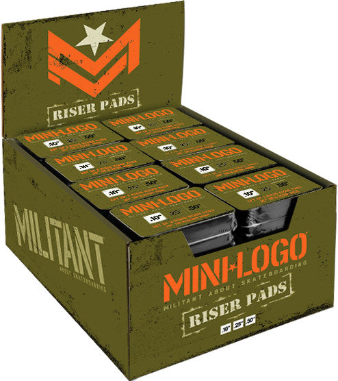 Mini Logo manufactures some of the best equipment in the skateboard industry. The creative team behind Mini Logo doesn’t skimp on quality materials or workmanship. Mini Logo does all things skateboarding, and they do it right! Handmade from high quality, 7 ply maple, Mini Logo skateboard decks are known for their long-lasting durability. Although their iconic color scheme may be military green, their decks are available in other colors as well. Mini Logo skateboard bearings put other brands to shame with their incredible speed. Made of tough chromium steel, their bearings guarantee a super fast ride! Maintain a stable ride and smooth turning with Mini Logo skateboard trucks. Their trucks have been tested by pro skaters to ensure optimal performance. Complete your skateboard with a set of Mini Logo skateboard wheels. The newest addition to Mini Logo’s product line, their skateboard wheels are no exception to overall performance. Made from a super-rebound urethane formula, Mini Logo skateboard wheels outperform and outlast any other brand. Their wheels are available in “A-Cut” for skateparks and “C-Cut” for streets. Keep a solid grip on your board with Mini Logo grip tape. Made of silicon carbide, their tape is long-lasting, easy to install, and holds exceptionally well. To give your board additional lift and support, use Mini Logo skateboard riser pads. They help keep your wheels spinning freely, and prevent your board from cracking against the pavement.