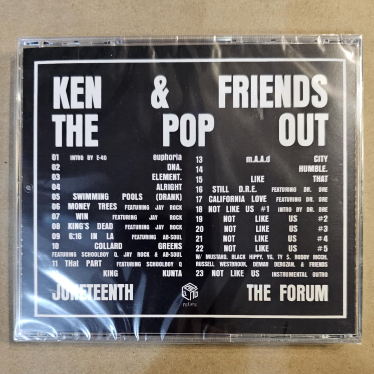 Dr. Dre and the rest of the West Coast joined Lamar at his first live performance since his Drake beef. The one-off concert titled The Pop Out - Ken and Friends, presented by pgLang and Free Lunch was jam-packed with a long line-up of artists, mostly from L.A. and California, who performed in Lamars hometown at the Kia Forum. From top to bottom, the entire event was a love letter to West Coast hip-hop culture, including a special appearance from Dr. Dre himself. The only physical release available of Kendrick Lamar's Juneteenth concert streamed less than a month ago on Amazon Prime. Featuring Kendrick's performance in its entirety, including "Not Like Us" six times in a row.