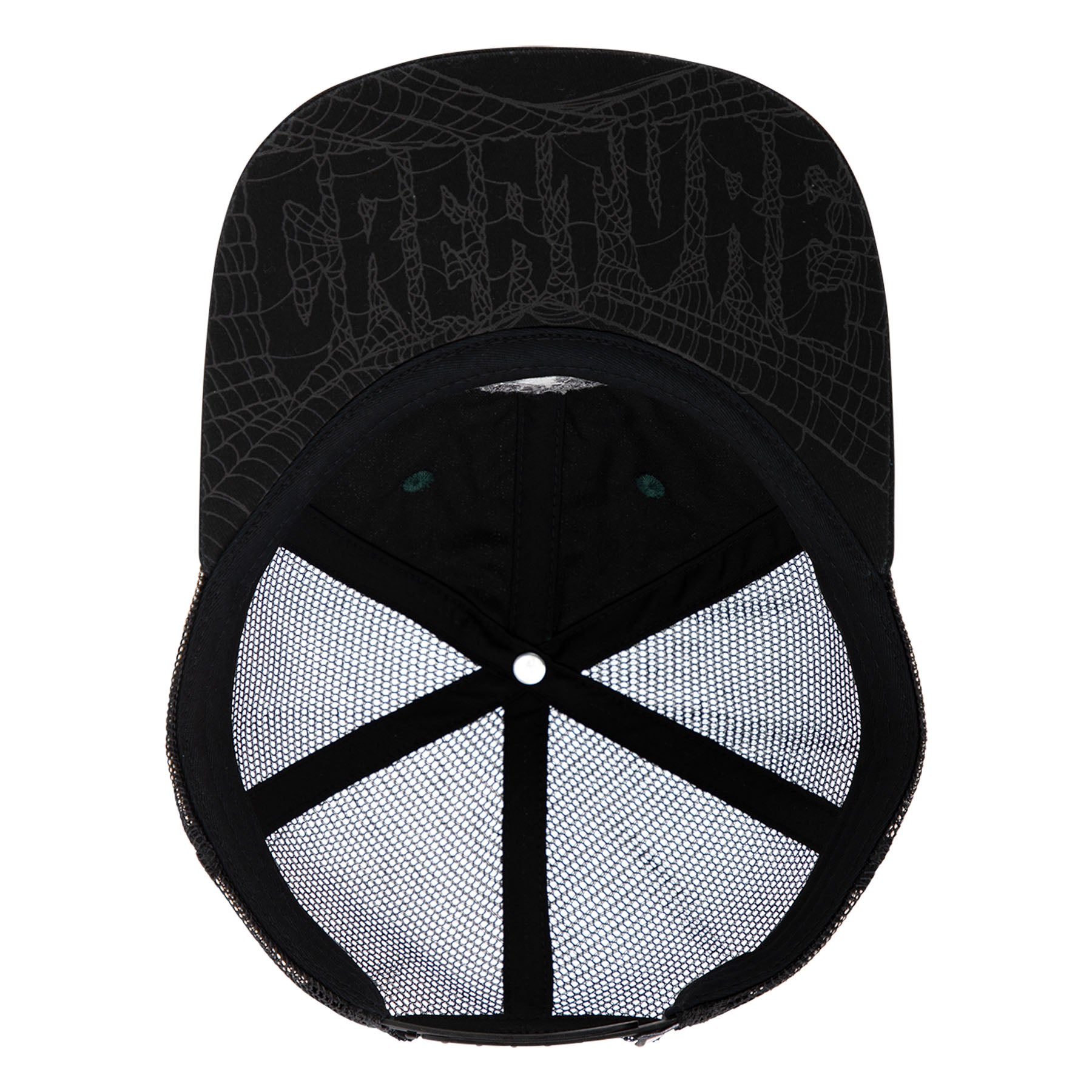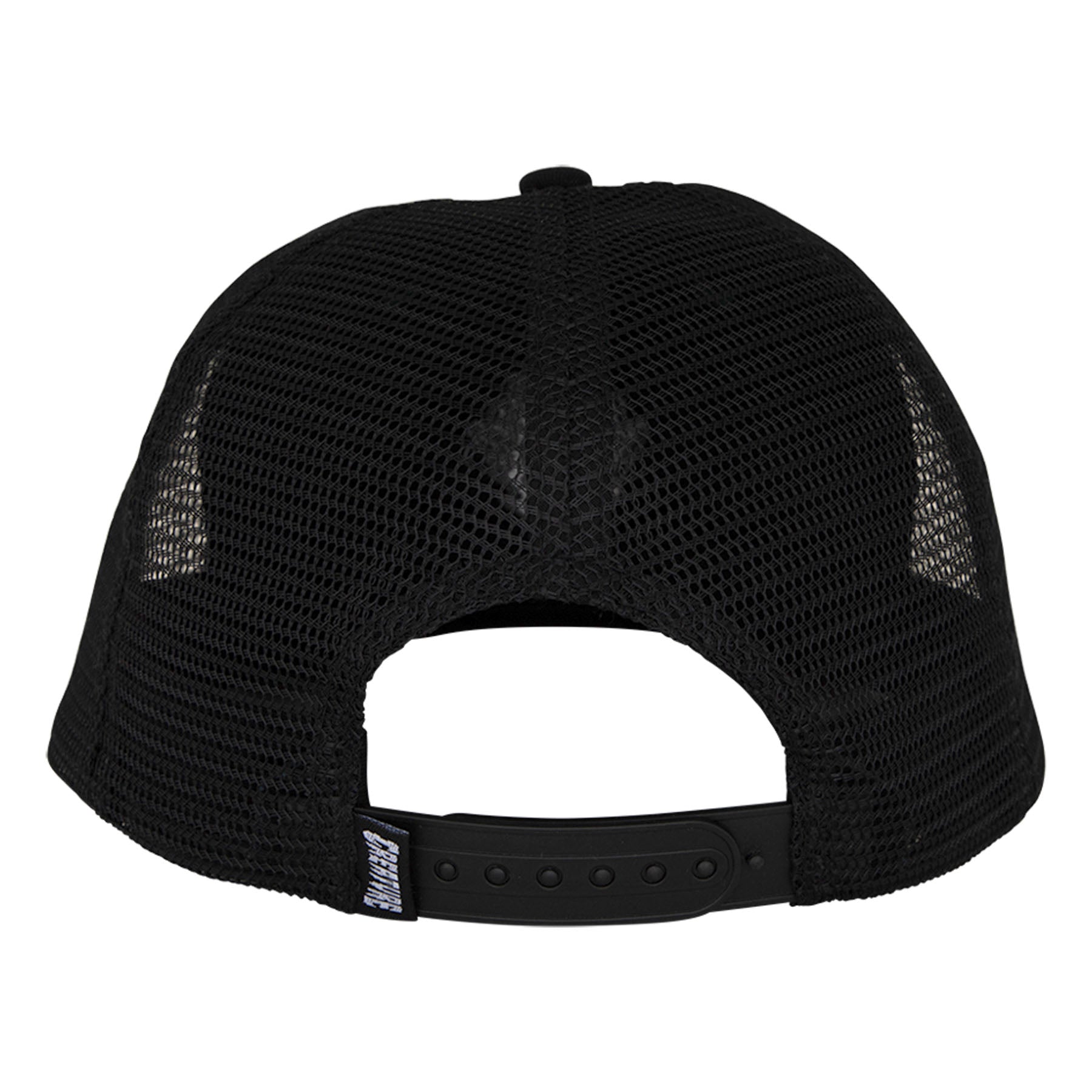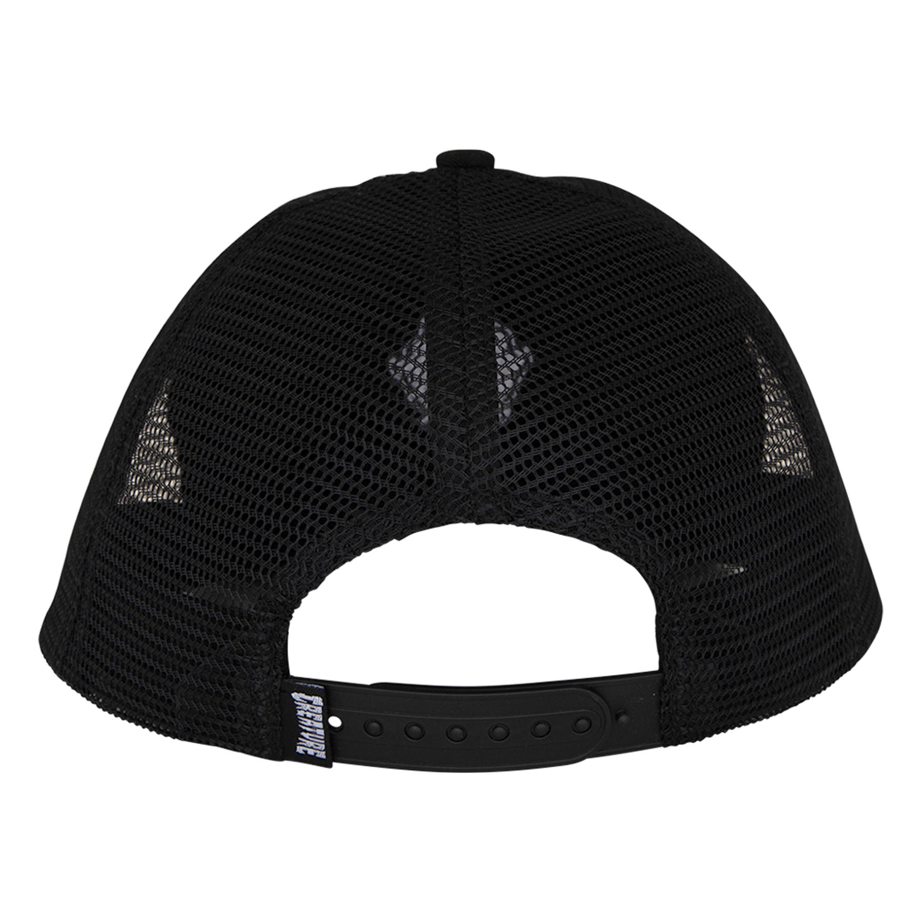 The Creature Bonehead Flame Wash low-profile fit, 6 panel structured mesh trucker snapback hat features direct embroidery, loop label at rear adjuster, custom under bill print and custom interior taping.