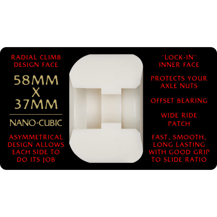 The NanoCubic's offset design allows it to have the perfect shape for both inner and outer edges to skate a wider range of obstacles. NanoCubics are smaller, lighter, and offset, so their large outer edge rolls up curbs, walls, and over cracks, and it covers your axle and nuts. The inner edge locks onto rails but releases when you need to.