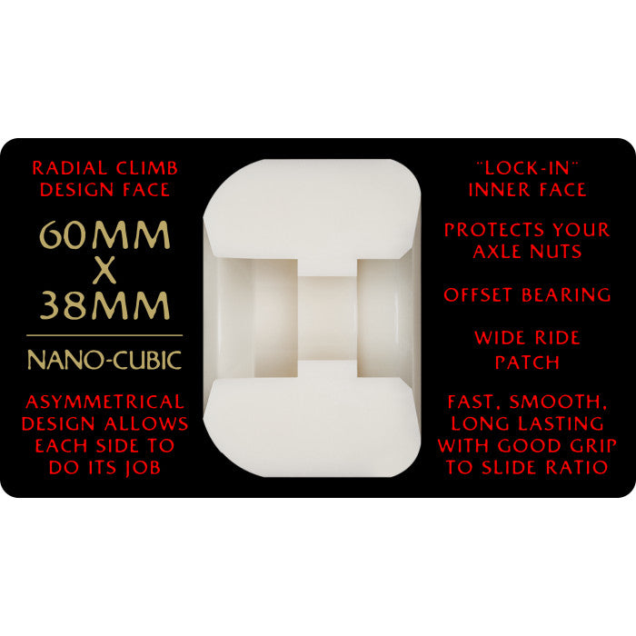 The NanoCubic's offset design allows it to have the perfect shape for both inner and outer edges to skate a wider range of obstacles. NanoCubics are smaller, lighter, and offset, so their large outer edge rolls up curbs, walls, and over cracks, and it covers your axle and nuts. The inner edge locks onto rails but releases when you need to.