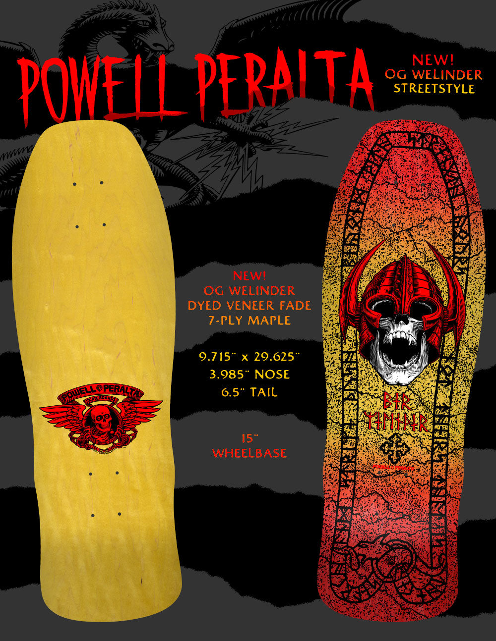The Per Welinder Viking Skull was illustrated by V.C. Johnson in 1984. The fanged fantasy graphic was meant to reflect Per's Swedish origins. It was initially assigned to his freestyle model without the rock texture background, which was added in an updated version in 1986. In 1987 the new full-length graphic was adapted for a street model as Per began performing freestyle/street demos. The eighth-century Runic stone lettering spells out Per's name as well as the background quote, "Search and strive, push beyond with strength, yours not theirs, that is the key." Something Per came up with. The graphic was also used for T-shirts and stickers.