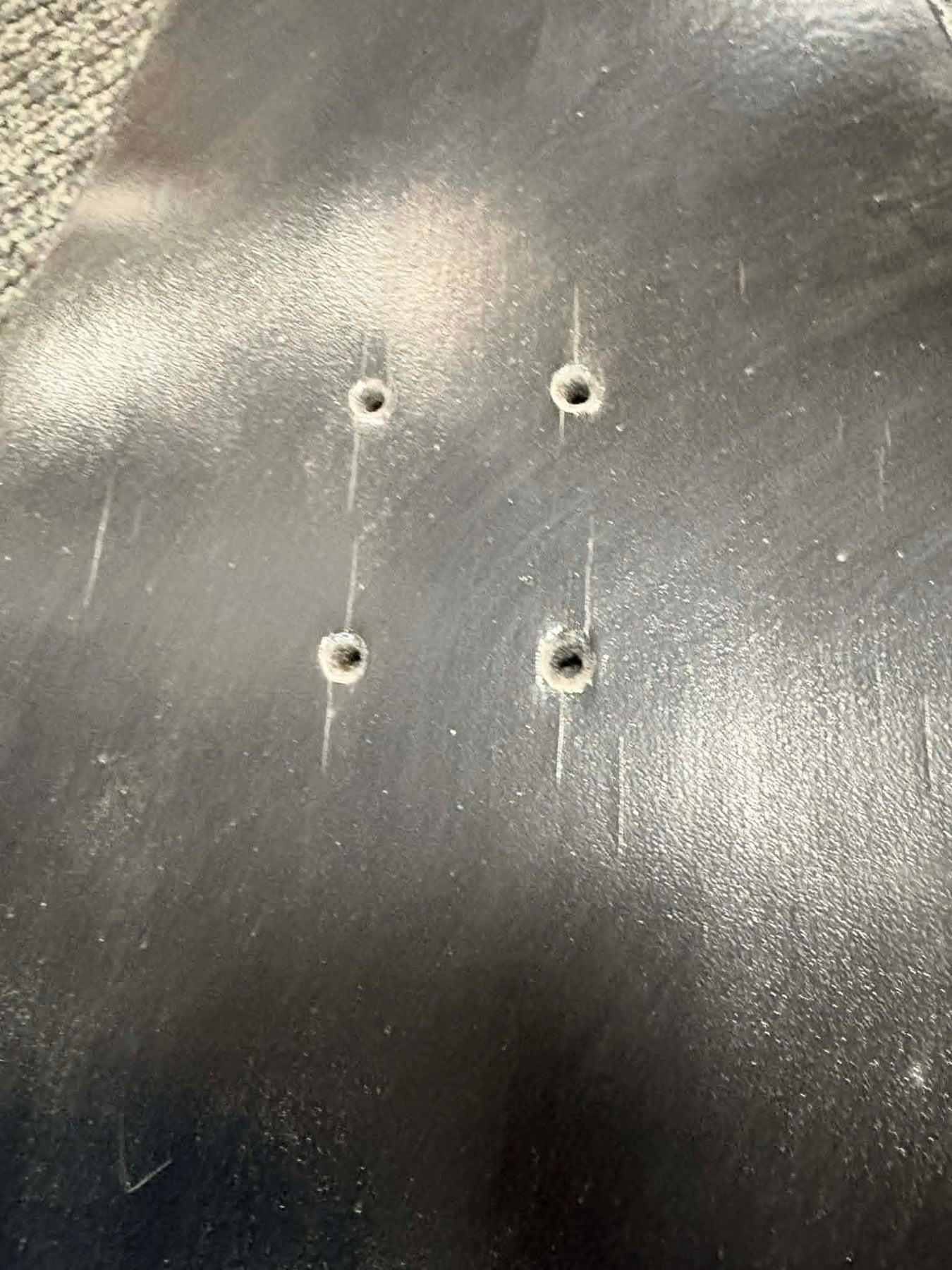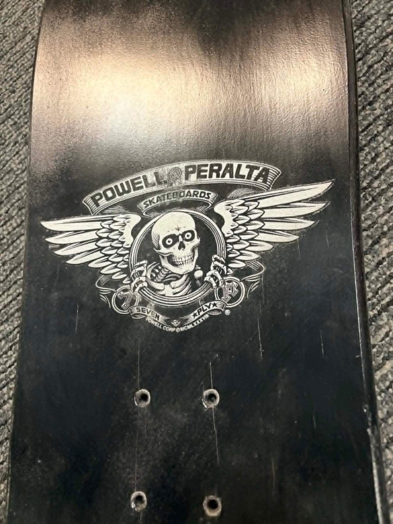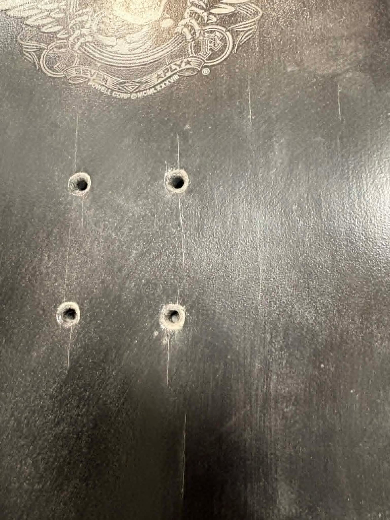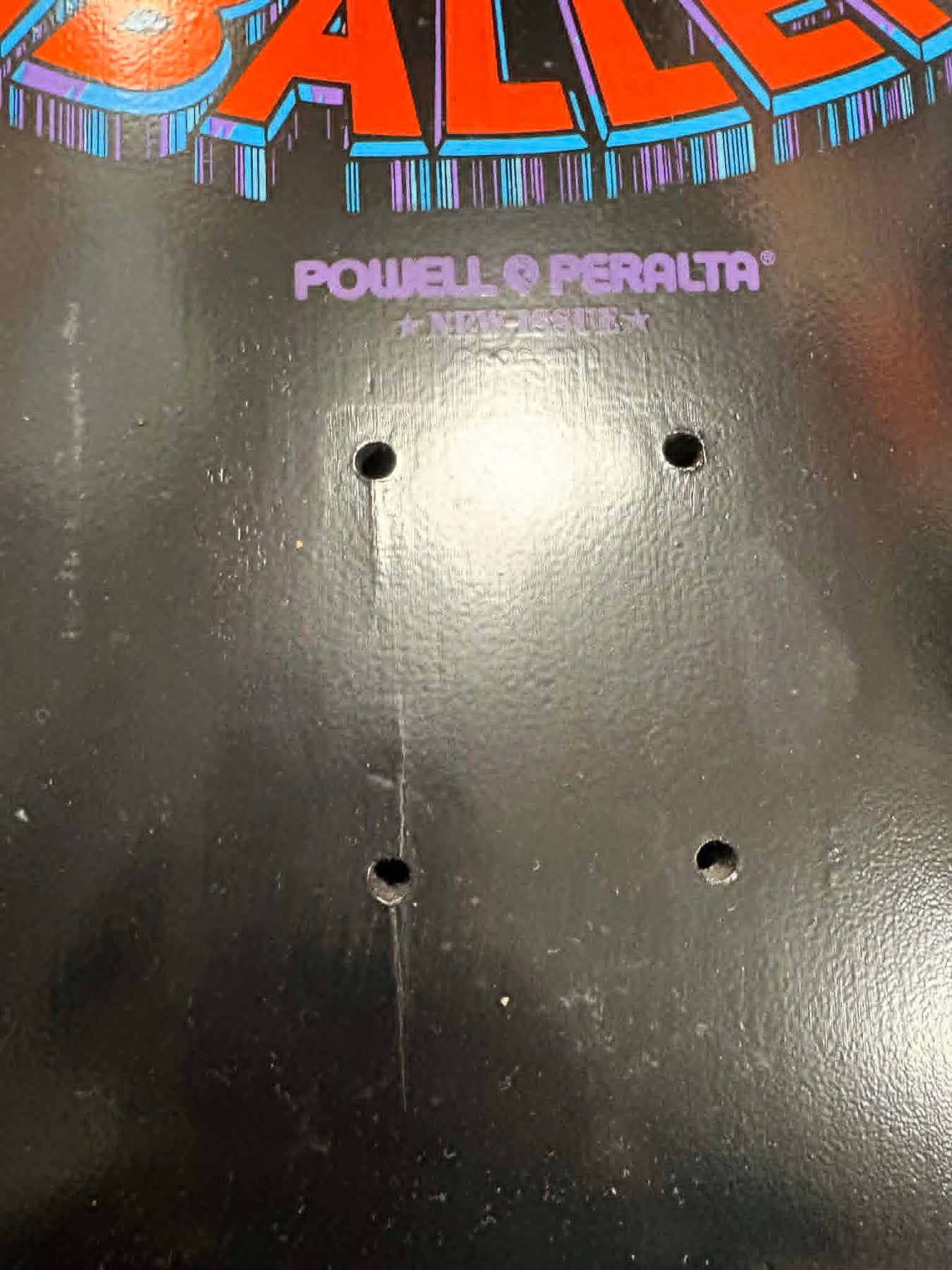 This deck has been set up, then touched up slightly, as you can see from the pics. Overall, the graphic is about perfect, but you can see some touch-ups near the tail and drill holes. It still looks great on your wall!