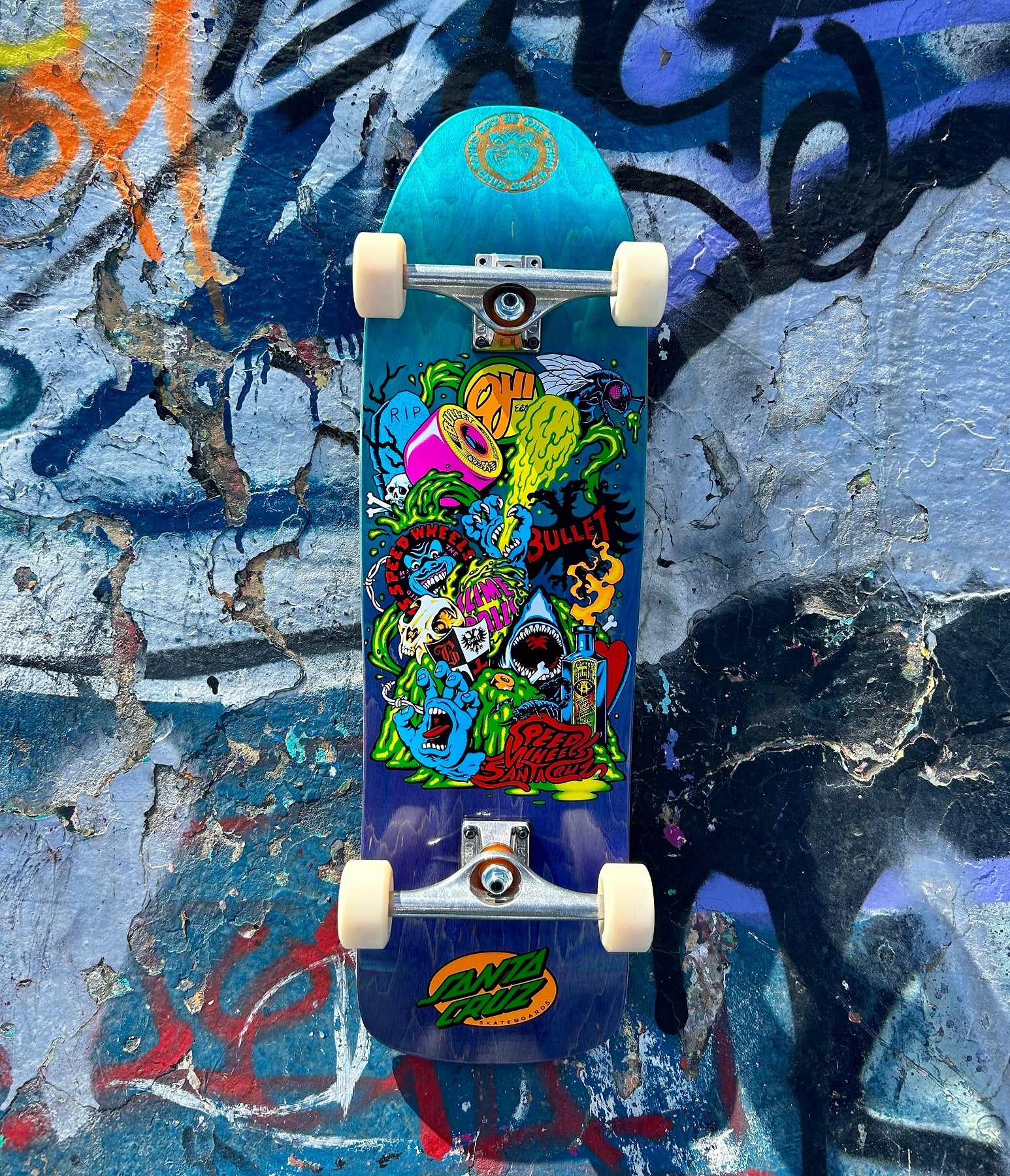 Santa Cruz Speed Wheels complete cruiser featuring Art of the Santa Cruz Speed Wheel poster art and heat stamped logo on nose with blue to purple stained veneer fade, Independent Stage 11 169 trucks, 61mm 97a OJII Teamrider reissue wheels, Independent GP-S bearings, and Genuine Parts 1/4" risers. Limited to 400 units celebrating the Art of Jim Phillips and Phillips Studios from the Golden Era of Santa Cruz Speed Wheels.