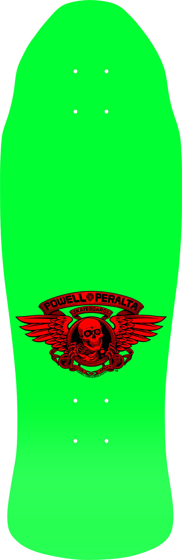 Powell-Peralta re-issue decks are close reproductions of their 1980s counterparts, featuring the original Pro graphics and shape, top graphic logo, and concave. They are manufactured in our Santa Barbara skateboard factory, which is still directed by a few of the same craftsmen who made them originally.