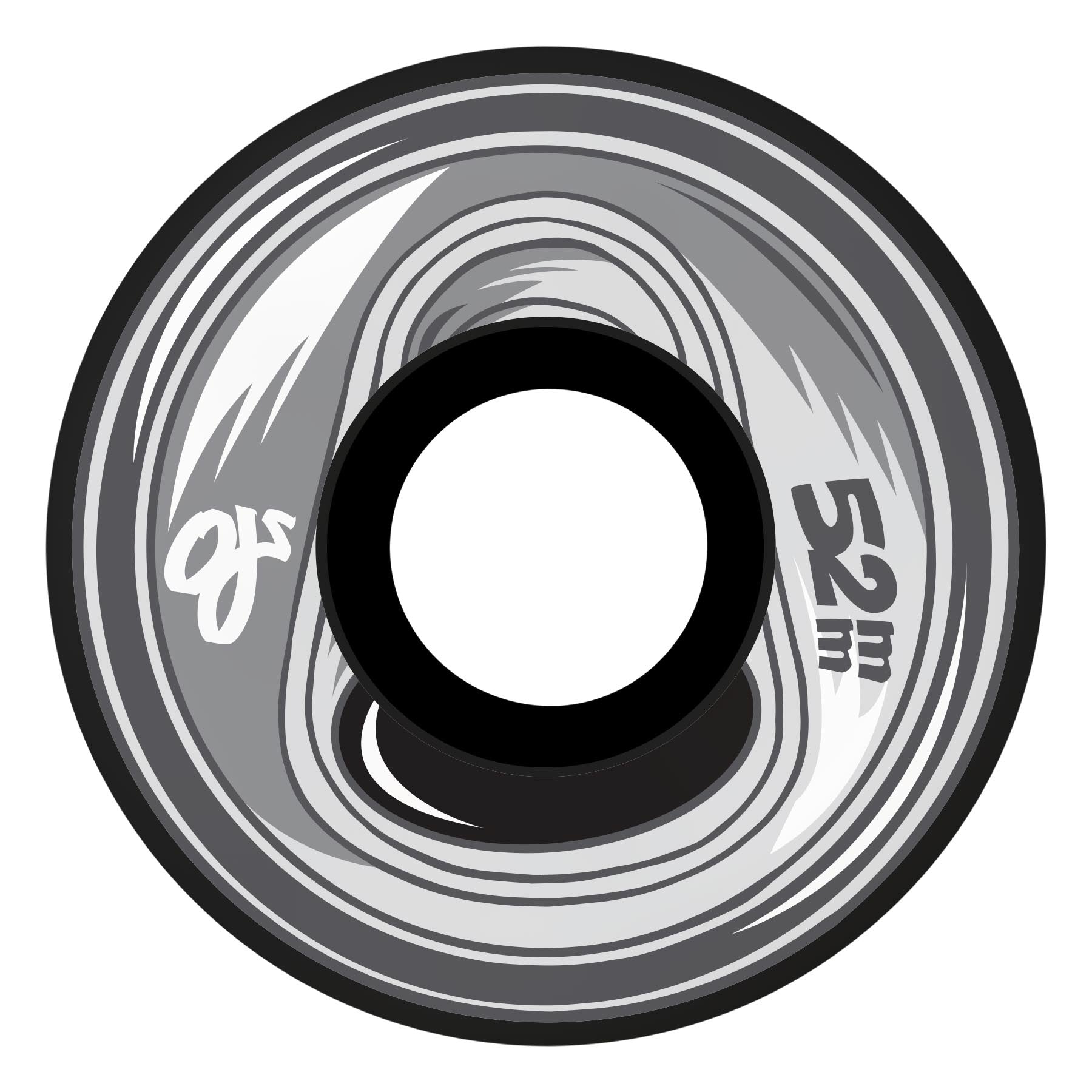Faster than words! OJ Wheels 52mm, 92a Frozen Energy Keyframe wheels black with cool grey can top graphics and custom can packaging. Blaze the roughest terrain with the raw energy of new 92a urethane!