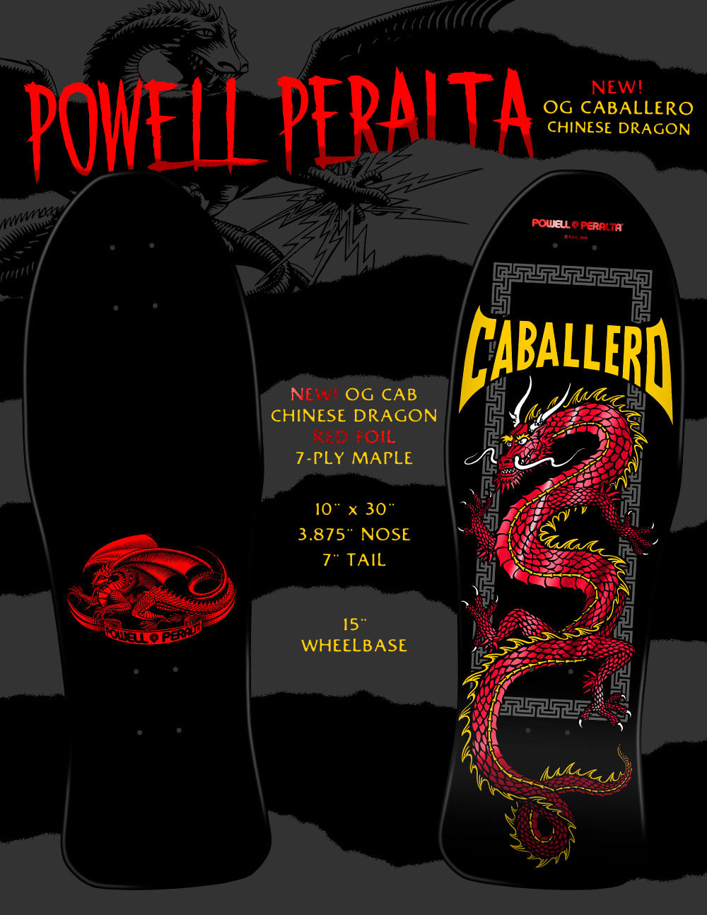 After a six year run, it was time to change up Caballero's deck graphic. Just in time for the filming of the Animal Chin video in 1986, a new dragon graphic was created for Cab. Now known as the Cab Chinese Dragon, the artwork was inspired by a Chinese takeout box and finally illustrated by VCJ. The Chinese Dragon came on a new "fish" shape in full size and mini. It was produced as 7-ply maple and also "Bonite" construction. It was discontinued in 1987.