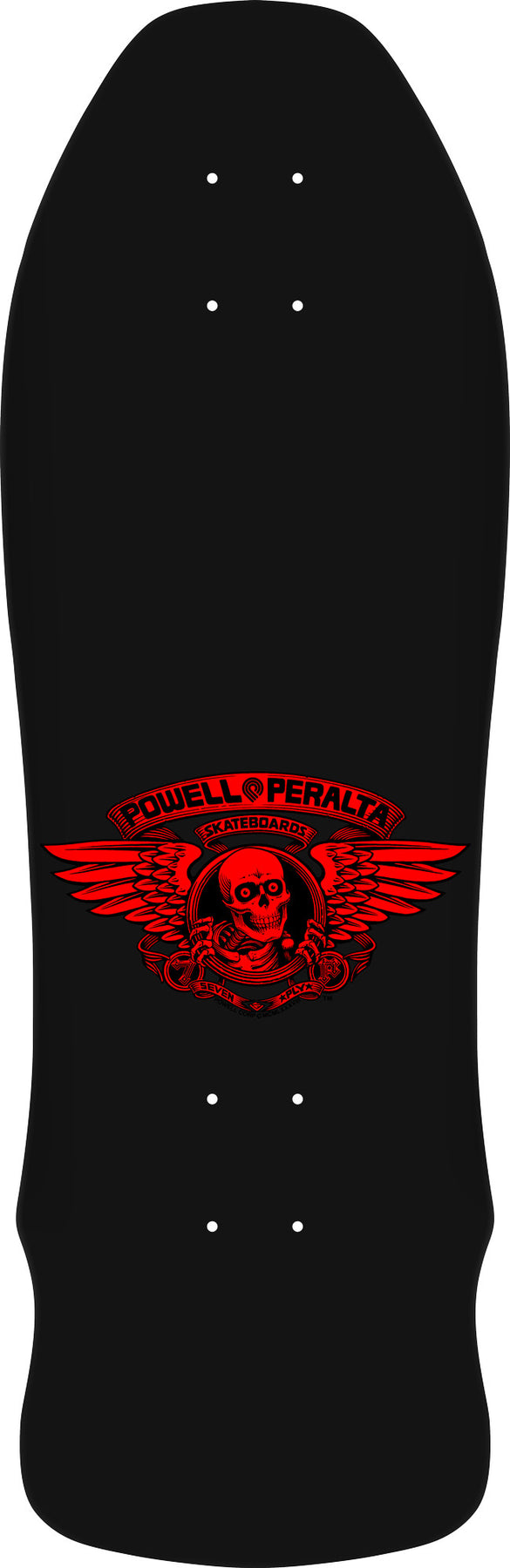 In 1986 jump ramps were all the rage. Easy to build, portable and fun to launch off of. Unfortunately, decks were snapping left and right. Powell-Peralta deck returns were so high the company sought ways to make decks stronger and more resistant to jump breaks. One solution was Bonite construction. Another was the "Gee-Gaw" shape which had bumps to reinforce the break zone area. Why "Gee-Gaw?" Ask Chris Iverson. This shape was also used for the Skull & Sword graphic. They were originally produced between 1987 and 1988.
